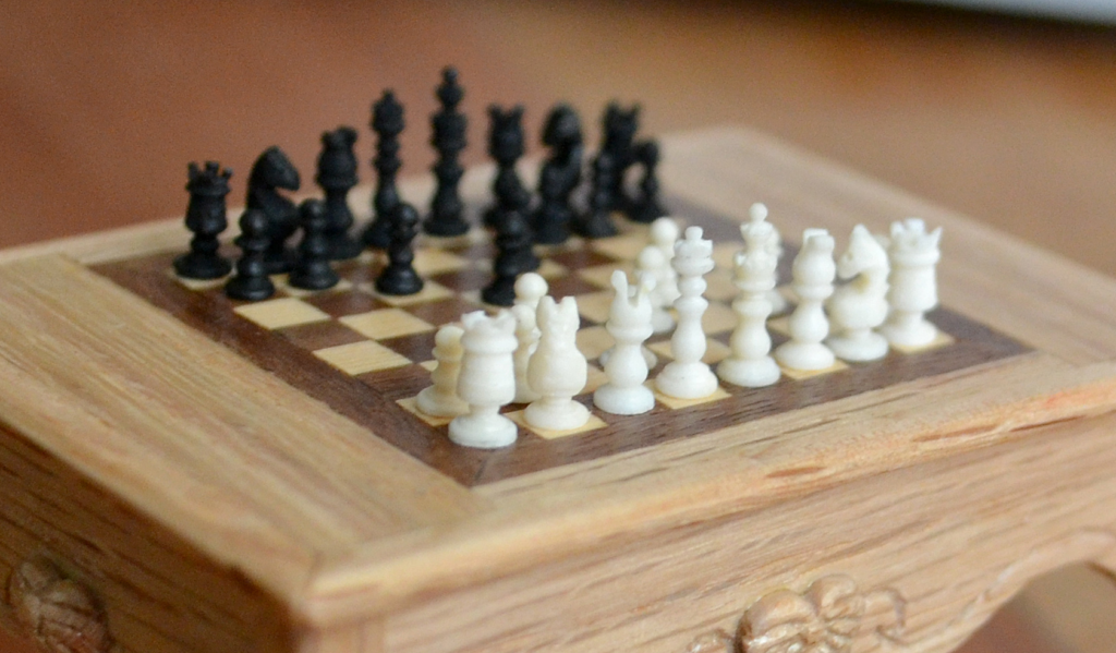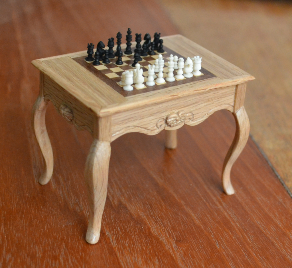 Hand turned deer antler from shed antlers. The white pieces are the natural color, the black pieces are dyed with acorn tannin. The chess table is hand carved white oak with black walnut and maple inlay for the board.
