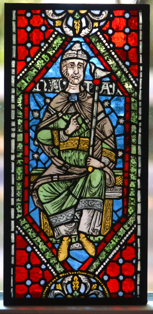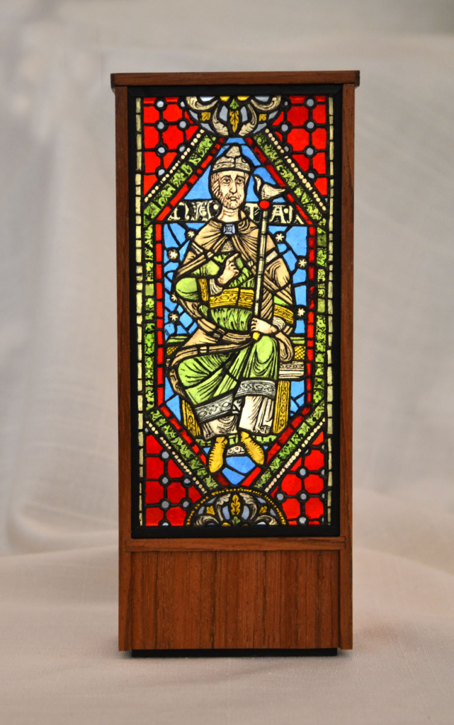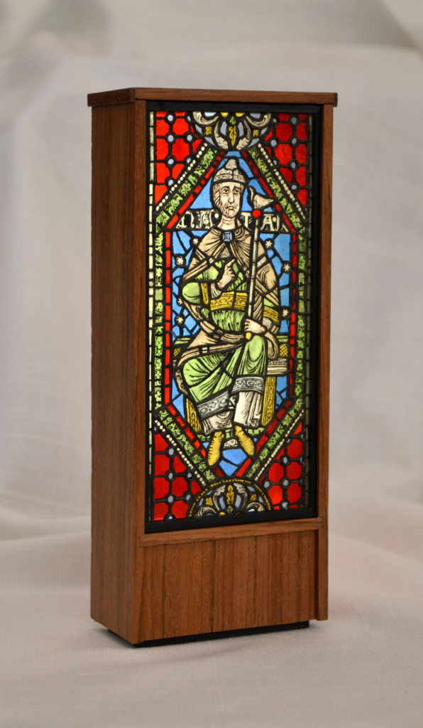 1:12 scale. Real stained glass that has been ground thin and polished. Traditional glass painting – hand painted and fired in a kiln. Canterbury cathedral design. Copper foil method assembly. Light box is vintage walnut. Photos show the window in the light box and in natural sunlight.