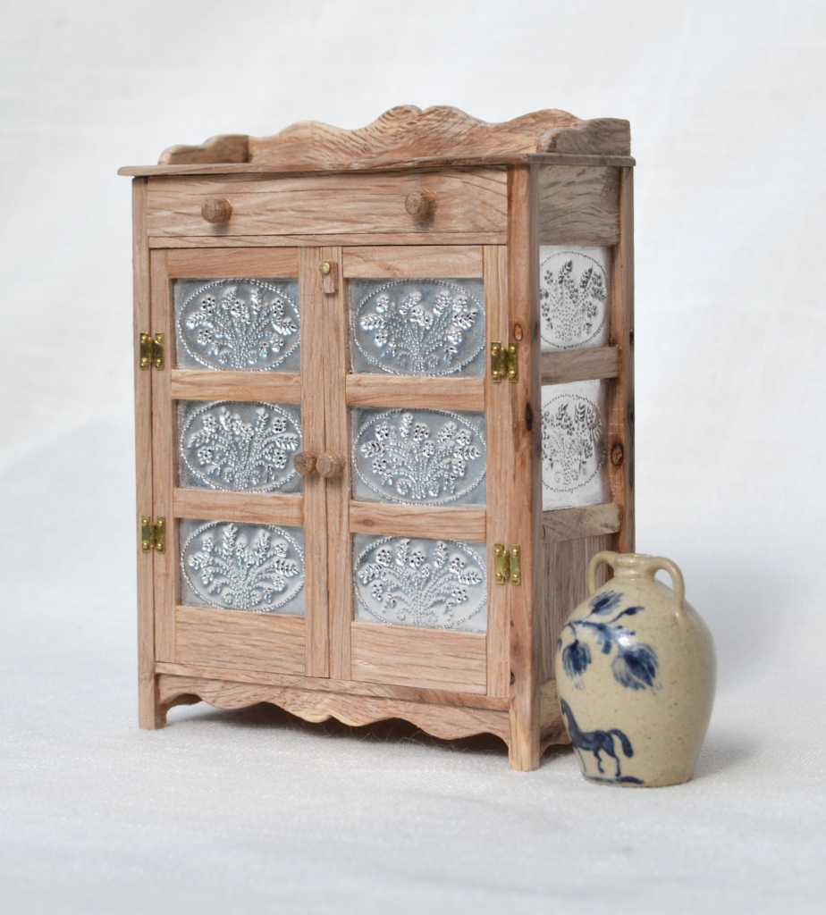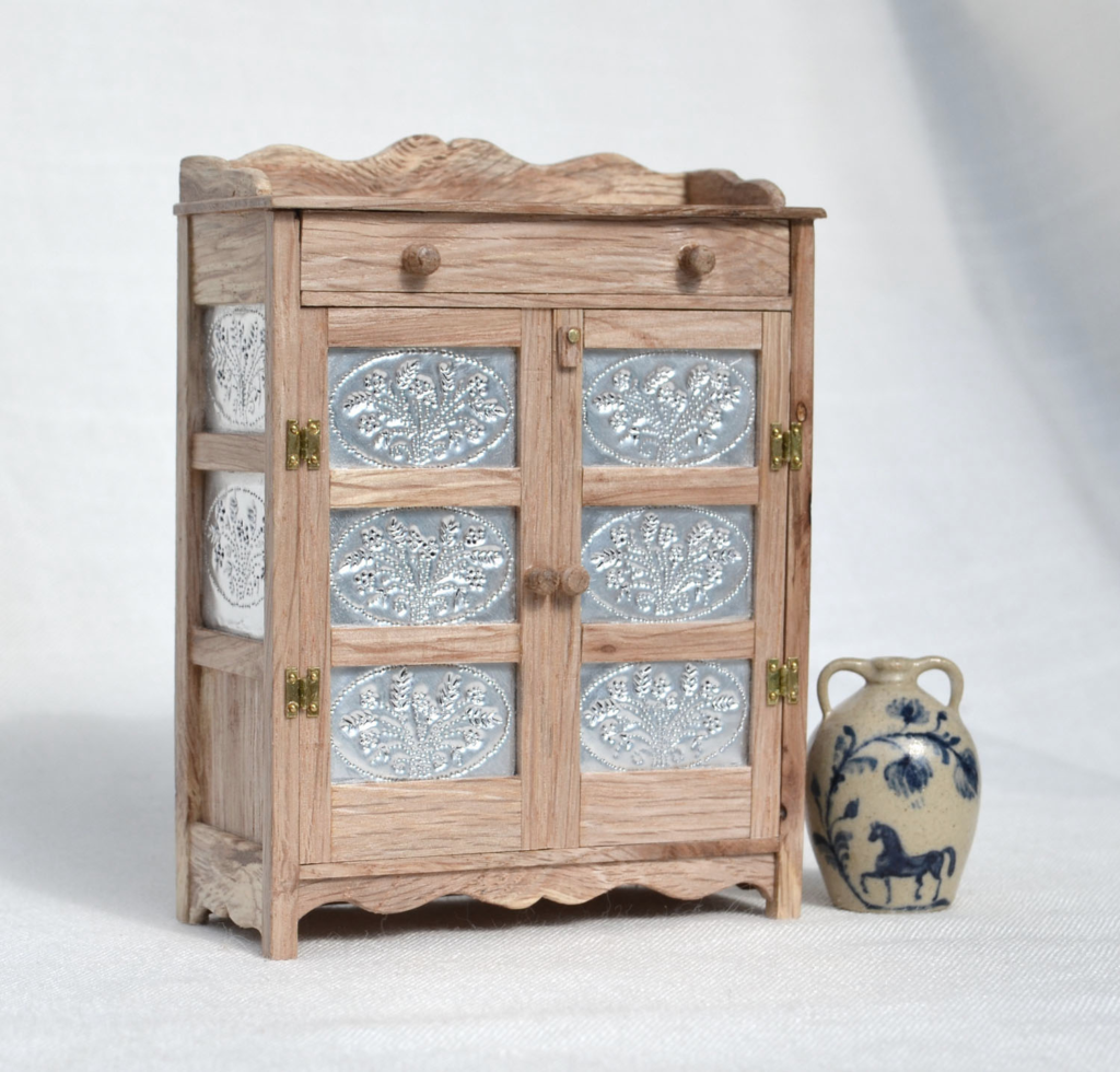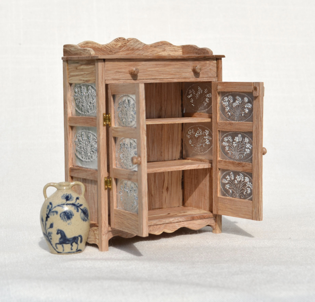 1:12 Scale Pie Safe – Spalted White Oak Wood with Punched Tin Flower Basket Motif. Hand Turned Knobs.
