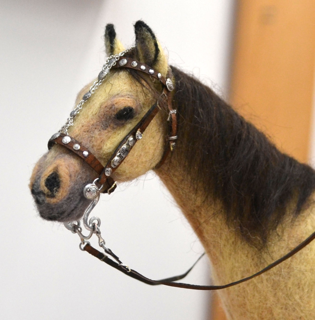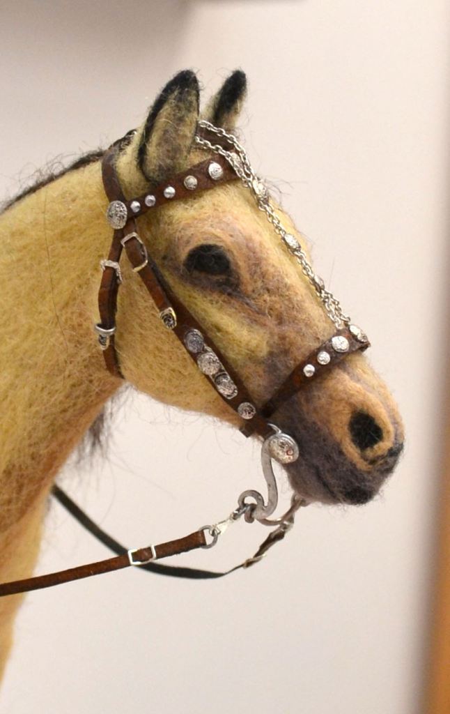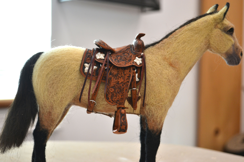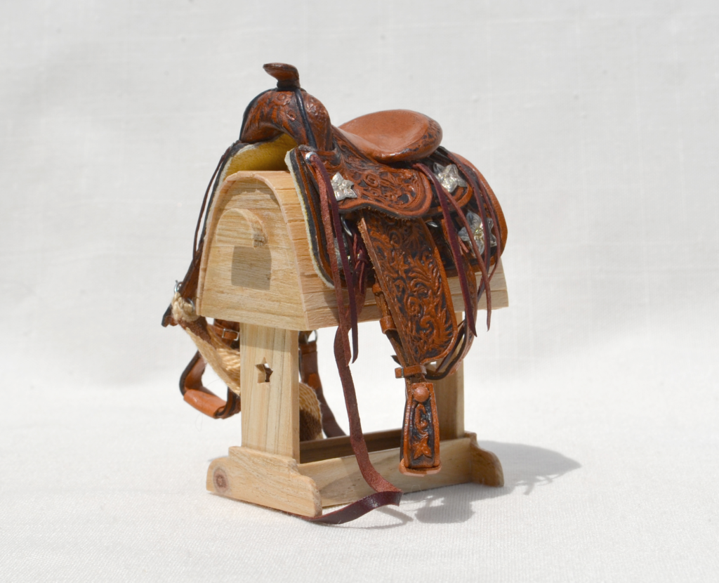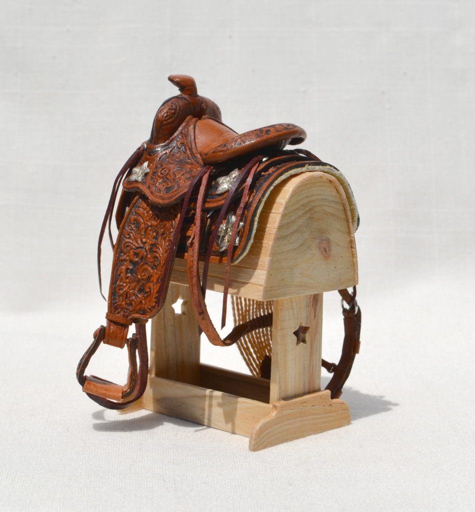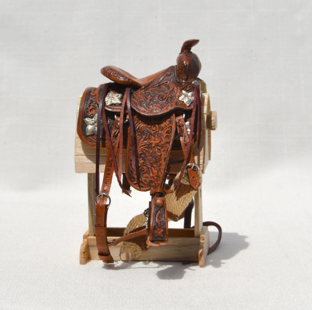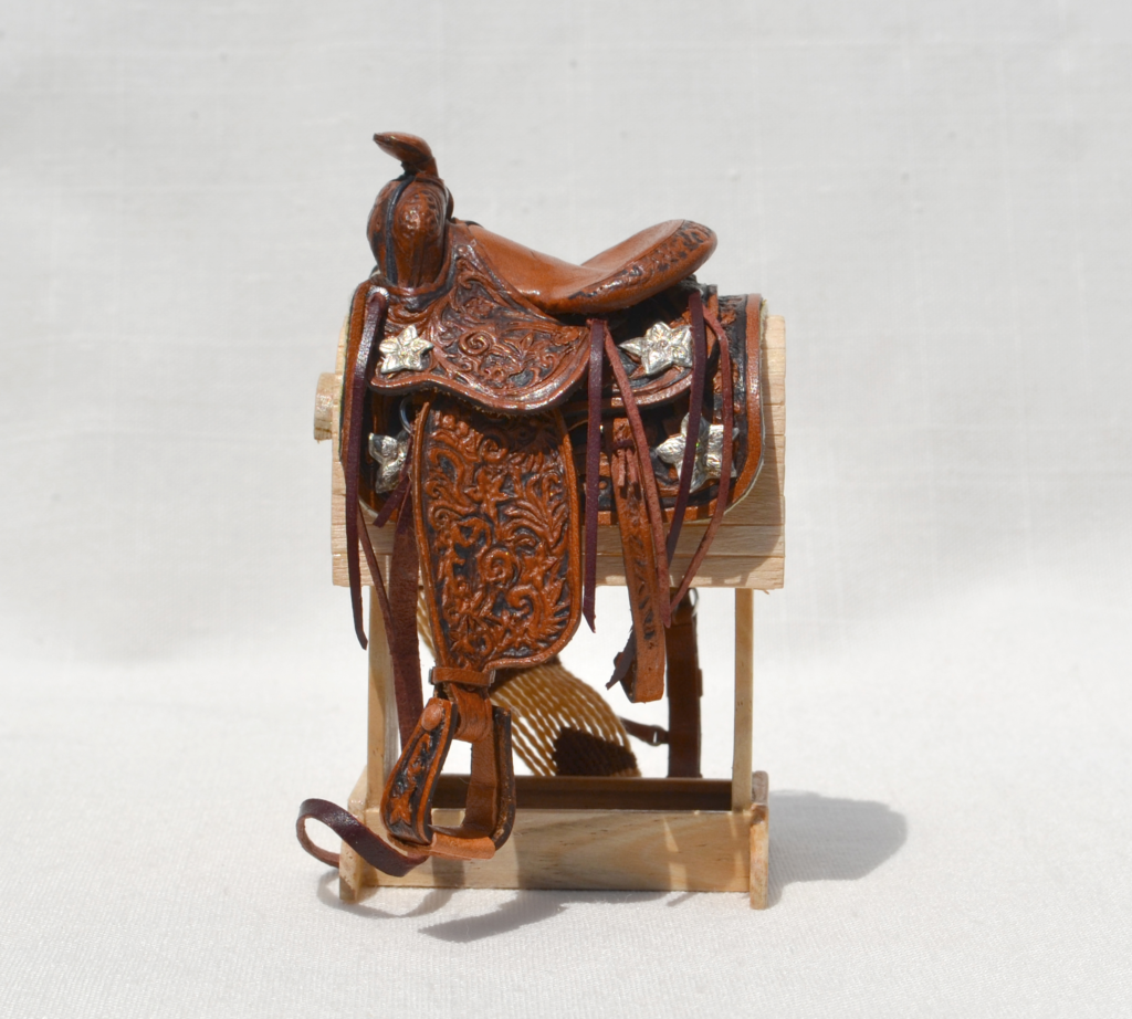 A reproduction in 1:12 scale of the western saddle used by the 1940 TV and movie Red Ryder cowboy character. This saddle was also used by Ben Cartwright in the TV series Bonanza. The saddle is hand tooled leather with hand made real silver conchos. The saddle stand is yellow pine. The horse, Buck, is needle felted.
