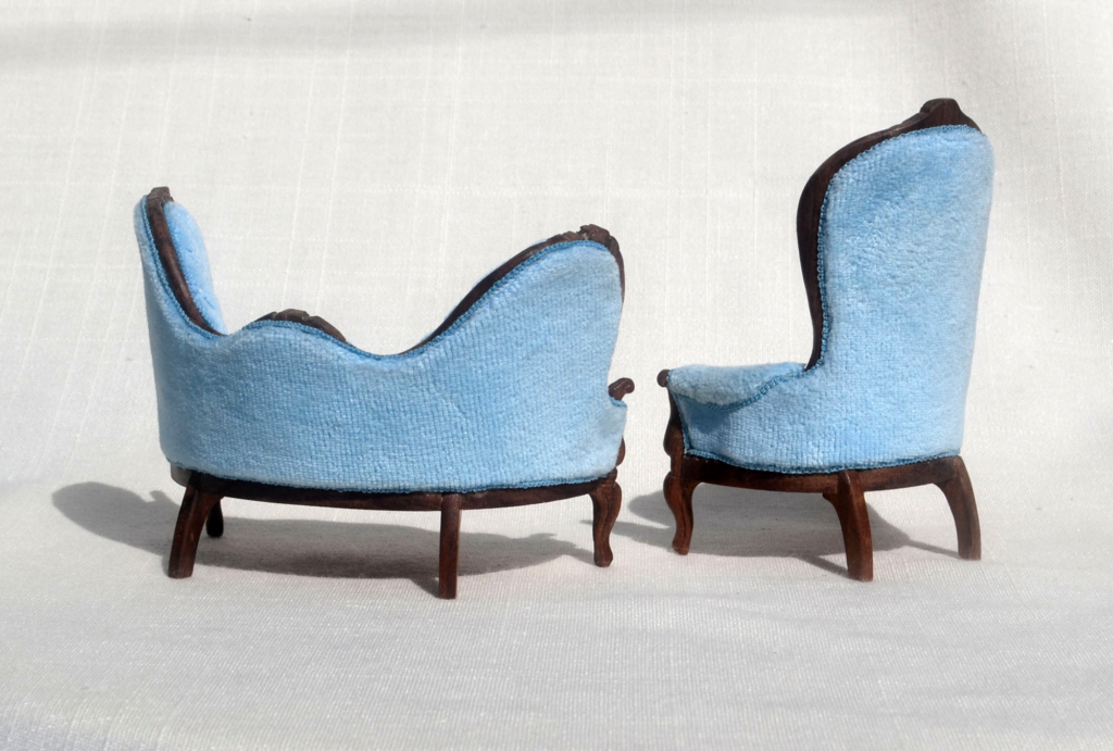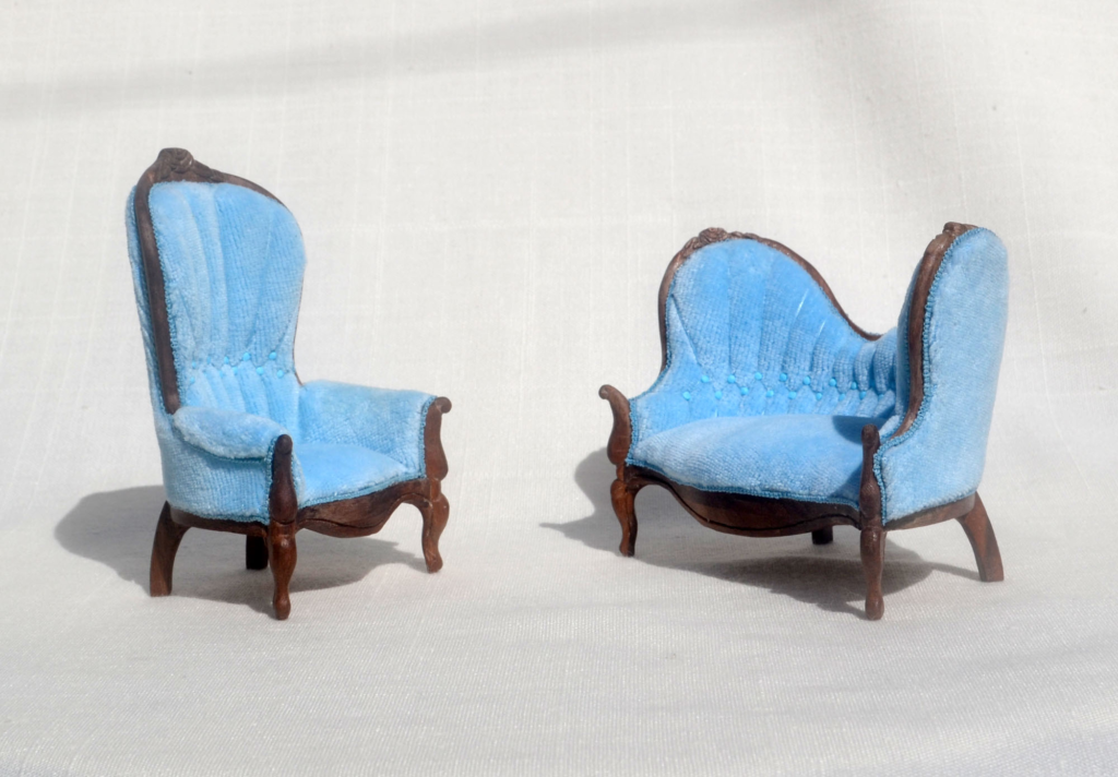 1:12 Scale Antique Cherry Wood – Blue Velour Upholstery – Hand Tatted Trim