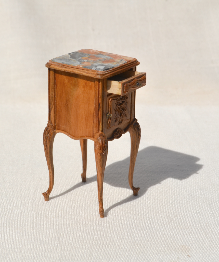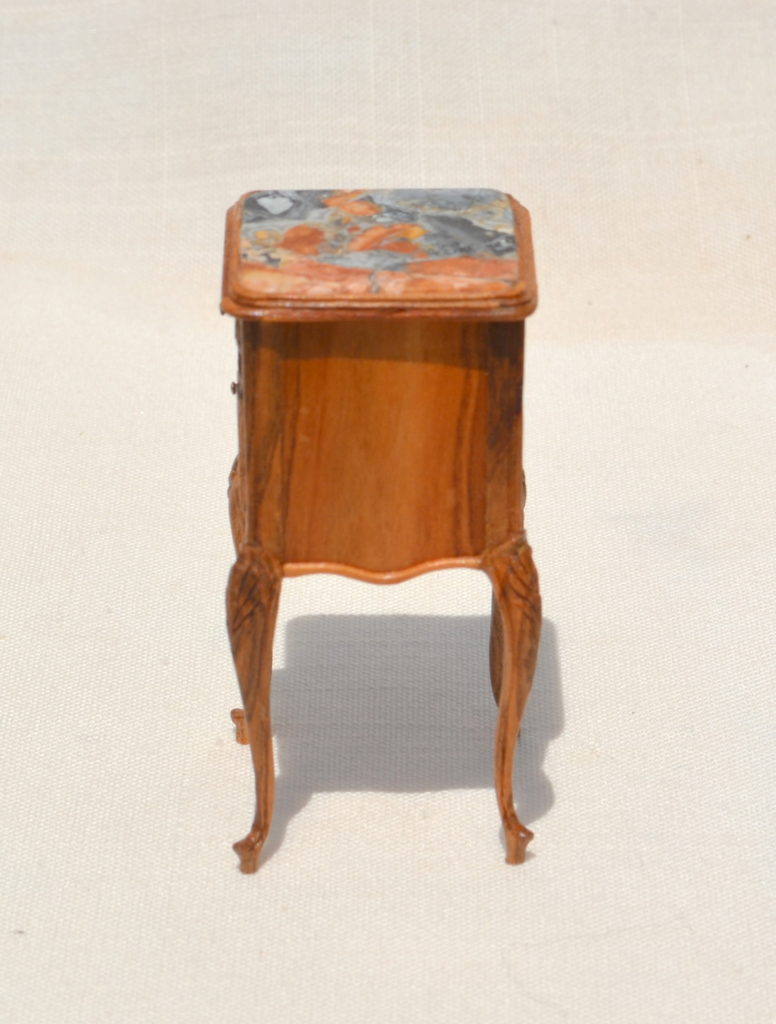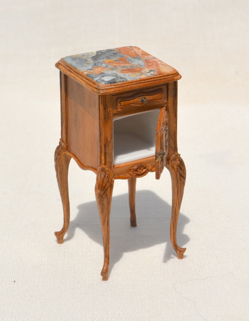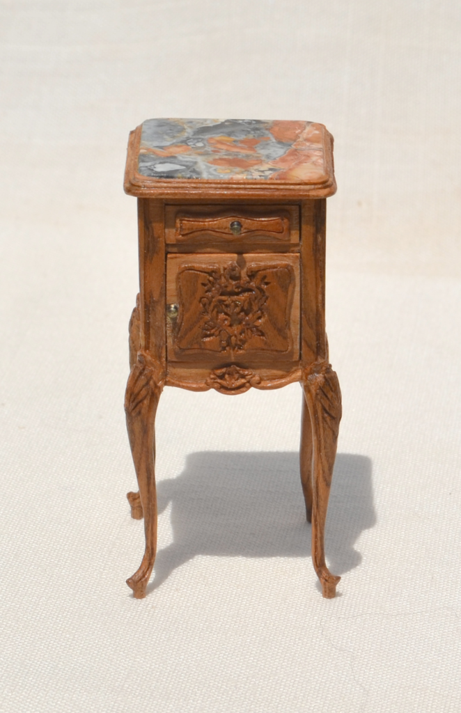 1:12 scale. Hand carved door and legs. Peach tree wood. Brass hardware. There is a real porcelain inset for a chamber pot on the inside. Drawer is dovetailed. Built with mortise and tenon joints. Picture jasper stone top, cut and polished.